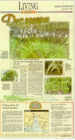 MOBILE PRESS REGISTER September 15, 1995 Imagine a forest 15 feet high, a few hundred yards wide...Oak trees a century old--gnarled like old men--and oly head high. Saw palmettos, crowning dune crests like stiff pickets. Fragrant carpets of evergreen shrubs, riding waves of sand, licked by gulf winds into a continuously flowing contour of sand and leaves..It is a forest like no other, stocked with plants and birds, animals and insects you were unlikely to see anywhere else in the state..beautiful like no other place on earth. |